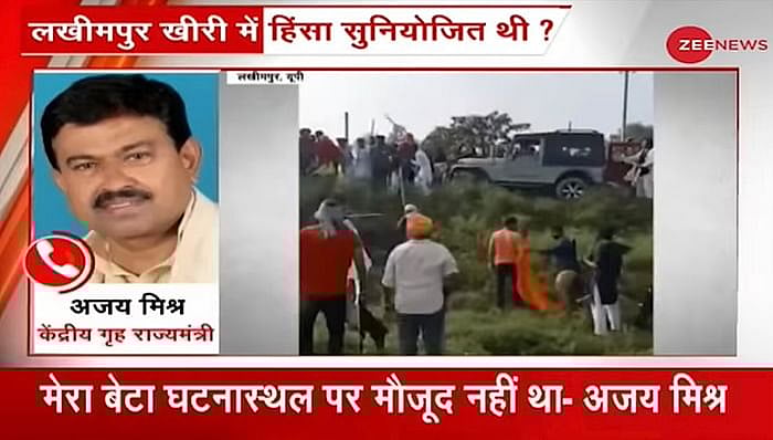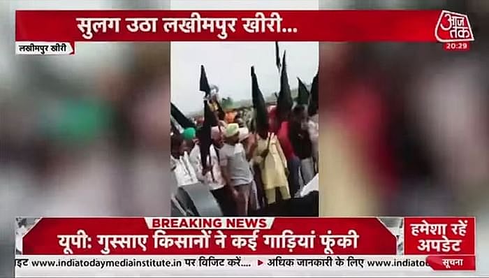 जलती हुई कारों के दृश्य यह कहते हुए दिखाएं कि यह कारें केंद्रीय मंत्री अजय मिश्रा के बेटे आशीष मिश्रा की थीं. खून से सने प्रदर्शनकारियों की तस्वीरें टीवी स्क्रीन पर एक भी बार नहीं दिखाई गईं. एंकर ने कहा, "इन जलती हुई गाड़ियों से निकलता हुआ धुआं इस बात का प्रमाण है कि आज किसानों ने अपना गुस्सा कैसे जाहिर किया, केंद्रीय मंत्री के बेटे की दोनों गाड़ियां किसानों के द्वारा जला दी गईं."