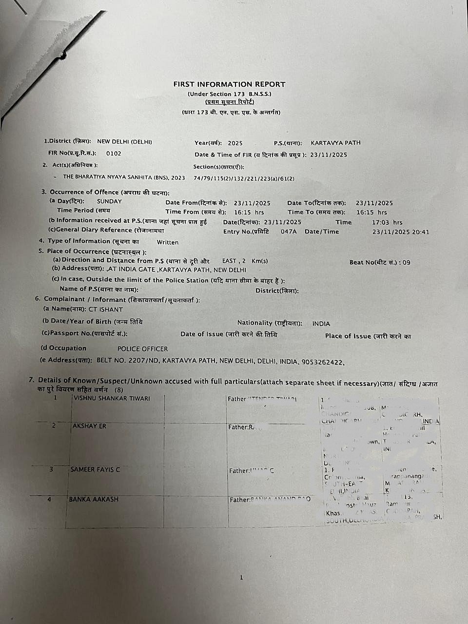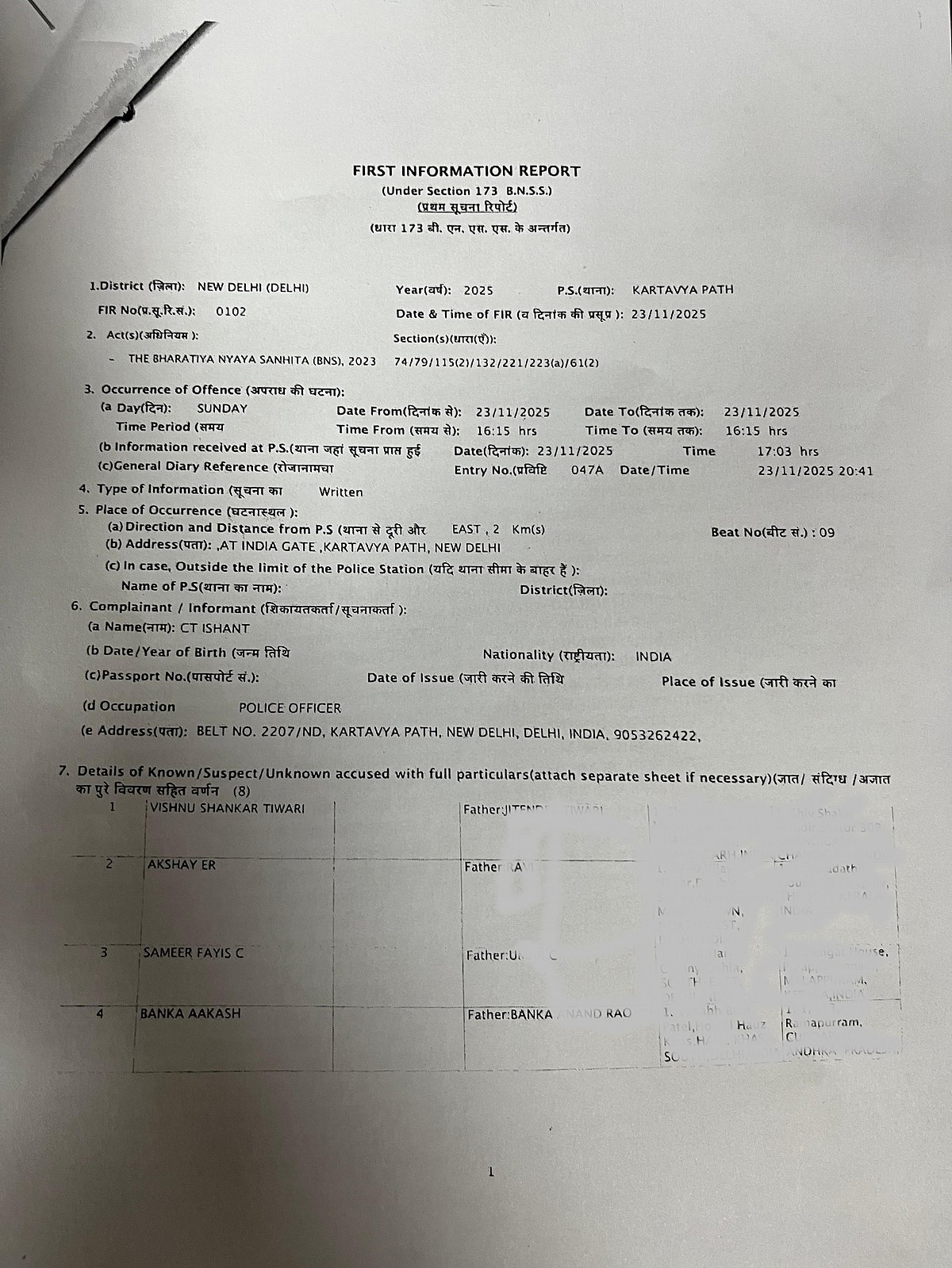 इस पूरे मामले में पुलिस ने दो फिर दर्ज की हैं. पहली कर्तव्य पथ थाने में दर्ज की गई है जबकि दूसरी पार्लियामेंट स्ट्रीट थाने में दर्ज की गई है. कर्तव्य पथ थाने में दर्ज एफआईआर के मुताबिक, शाम करीब 4:15 बजे प्रदर्शनकारी इंडिया गेट स्मारक के पास पंपलेट और बैनर लेकर इकट्ठा हुए और नारेबाजी करने लगे. 15 से 20 मिनट बाद सारे प्रदर्शनकारी पुलिस बैरिकेड फांदकर नारेबाजी करने लगे. इस दौरान दौरान प्रदर्शनकारियों ने ‘हिडमा अमर रहे’, ‘कितने हिडमा मारोगे’, ‘हर घर से हिडमा निकलेगा’, ‘हिडमा जी को लाल सलाम’ आदि नारे लगाए. एफआईआर के मुताबिक, प्रदर्शनकारियों को बार-बार यह बताया गया कि इंडिया गेट पर धारा 163 लागू है. जिसके अनुसार, यहां पर धरना प्रदर्शन करना कानूनी तौर पर अपराध है. उसके बावजूद भी उन्होंने प्रदर्शन जारी रखा. जब पुलिस ने प्रदर्शनकारियों को वहां से हटाने की कोशिश की तो वह उग्र हो गए और पुलिस पर पेपर स्प्रे इस्तेमाल करने सहित पुलिसकर्मियों से बदसलूकी की. इस एफआईआर में कुल आठ लोगों को नामजद किया गया है, जिन पर बीएनएस की धारा 74, 79, 115 (2), 132, 221, 223 (ए) और 61 (2) लगाई गई है.